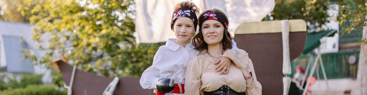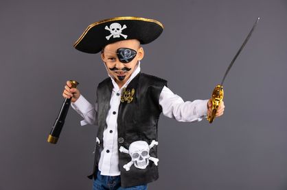 Elementul de bază al costumului de pirat este o cămașă albă, pe care o poți completa cu o vestă neagră, roșie sau albastră. Pentru partea de jos, merg de minune niște pantaloni negri simpli, dar dacă ai puțin timp, poți confecționa o pereche până la genunchi, cu marginile tăiate în franjuri, în nuanțe de roșu, negru sau maro. Adaugă un bandaj peste un ochi și un batic sau o pălărie de pirat pe cap. Pe față, poți desena cicatrici și o mustață răsucită pentru un efect autentic. Nu uita de accesorii: o sabie și o lunetă de jucărie sunt esențiale, iar un papagal de pluș pe umăr va completa perfect ținuta.Exersează cu cel mic accentul de pirat și pregătiți-vă să porniți într-o adevărată aventură pe mările lumii!