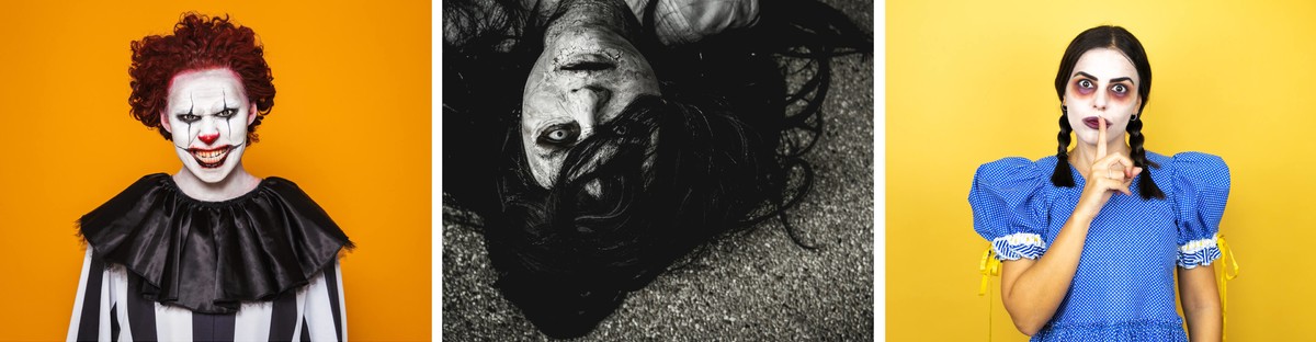 - Păpușă horror: Transformă-te într-o păpușă... dar una care dă fiori! Alege o rochie cu volane și imprimeu drăgălaș, apoi vopsește-ți fața în alb. Adaugă obraji roz, umbre întunecate în jurul ochilor și desenează balamale la gură sau crăpături fine pe frunte. Exersează o expresie facială nebună și învață o replică înfricoșătoare pe care să o tot repeți.