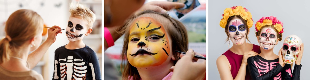 Începe prin a-ți acoperi întreaga față cu machiaj alb. Trasează cercuri negre în jurul ochilor și aplică negru pe vârful nasului. Desenează linii subțiri din colțurile gurii până la urechi și linii verticale pe buze, pentru a sugera dinții. La final, adaugă puncte colorate, valuri, flori și alte modele în jurul ochilor, pe frunte și pe bărbie. Pentru un plus de efect, poartă o coroniță sau o bentiță cu flori — machiajul e ușor de făcut și va arăta spectaculos!