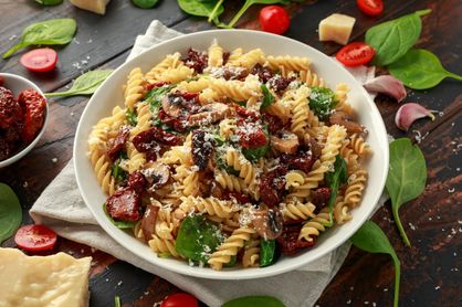 La final, se adaugă restul de roșii uscate și busuioc tocat, parmezanul ras și o lingură de ulei de măsline. Se amestecă și se servește.
