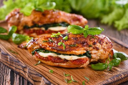 Punem bucățile de pui într-o tavă adâncă, le stropim cu ulei de măsline și le coacem timp de 20 de minute, până când carnea este gătită (temperatura internă trebuie să ajungă la aproximativ 72 °C), iar brânza s-a topit. După coacere, putem unge puiul cu pesto de busuioc, după gust, și îl servim cu salată sau cartofi.