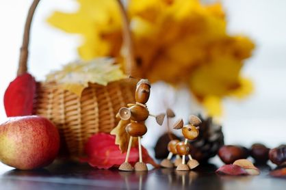 - Figurine și animale din bețișoare: Un clasic pe care sigur îl cunoști și tu... Pregătește dinainte găurile pentru scobitori sau bețele de frigăruie. Pentru a fixa castana fără risc, poți folosi un spărgător de nuci în locul uneltelor ascuțite. Poți folosi și măceșe, ghinde, fructe de scoruș și alte comori ale naturii. O căciuliță de ghindă este un accesoriu perfect pentru capul figurinei, iar fructele de scoruș pot deveni mâini colorate și creative. Sârma plușată (chenille) este, de asemenea, ideală pentru realizarea membrelor.