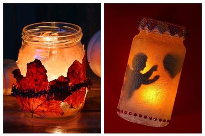 - Poți crea și un felinar colorat: aplică un strat de adeziv lichid pe borcan, lipește frunze de toamnă sau bucăți de hârtie creponată în culori diferite. Fixează totul cu un al doilea strat de adeziv și lasă să se usuce bine.