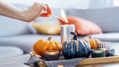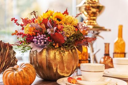 - Poți folosi un dovleac și în loc de vază. Taie partea de sus a dovleacului, în jurul codiței, scoate miezul și semințele cu o lingură, căptușește interiorul cu o pungă de plastic și așază înăuntru flori. Folosește materiale adunate din grădină sau la o plimbare de toamnă: fructe de scoruș, măceșe, spice uscate de grâu. Acestea se potrivesc foarte bine cu flori tăiate precum crizantemele, Jakobinia, narcisele sau daliile – rezistă bine și aduc culoare și energie spațiului.
