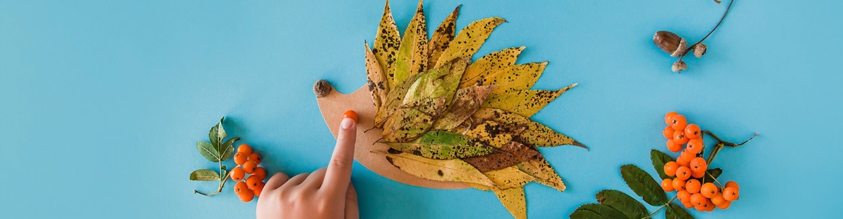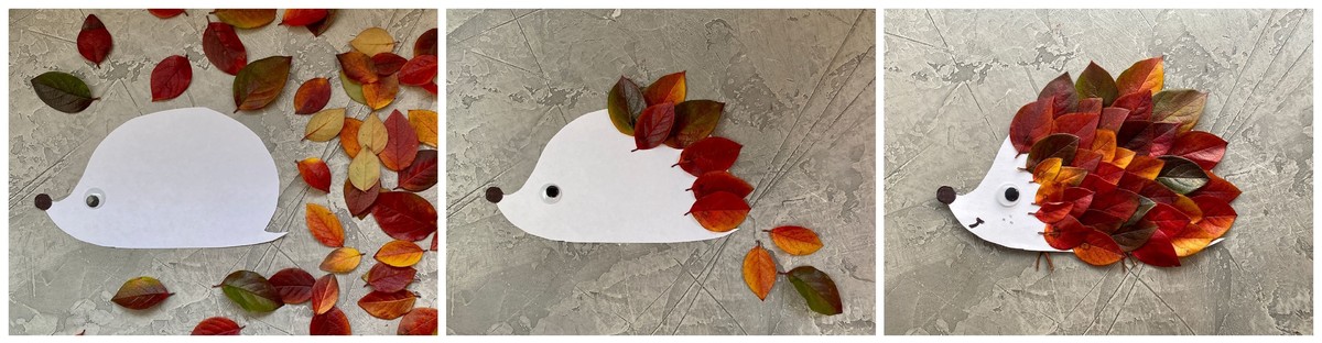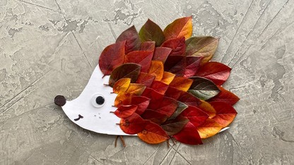 Desenează conturul unui arici pe o foaie A4 și decupează-l. Cu un marker negru, desenează-i un năsuc și o gură. Poți lipi și ochi mobili pentru un efect jucăuș. Apoi, din spate spre față, lipește frunze proaspete pe șablon. Suprapune-le din dreapta spre stânga, așa cum ai lipi solzii unui pește.