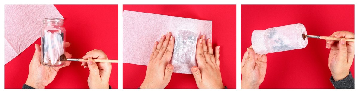 Decupează din hârtia neagră formele dorite (de exemplu: înger, copac, animal, inimă) și lipește-le cu bandă adezivă pe interiorul borcanului. Aplică lipici lichid pe toată suprafața exterioară a borcanului, apoi lipește hârtia de mătase albă. Fixeaz-o bine cu încă un strat subțire de adeziv. Lucrează cu grijă - hârtia de mătase este foarte fragilă și, odată umezită, se rupe ușor.