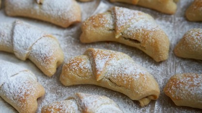 Se înfășoară aluatul în folie alimentară și se lasă la rece timp de 1–2 ore. Apoi se împarte în patru părți și se modelează din ele bile mai mari. Fiecare bilă se întinde la grosimea de aproximativ 3 mm. Cu un cuțit sau o riglă, se taie cercurile în opt triunghiuri egale – o ocazie perfectă pentru a recapitula fracțiile, nu doar pentru școlari! Pe partea lată a fiecărui triunghi puneți o linguriță de gem și rulați până la vârf. Îndoiți ușor capetele ruloului și sigilați-le atent, ca gemul să nu iasă în timpul coacerii.