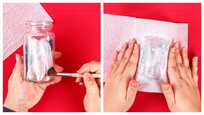 Hârtia de mătase se comportă asemănător unui material textil, așa că folosește lipiciul și pensula pentru a finisa frumos marginile. Înainte ca adezivul să se usuce, poți decora lampionul cu sclipici și alte ornamente. Dacă vrei, acoperă îmbinările hârtiei cu o panglică decorativă.