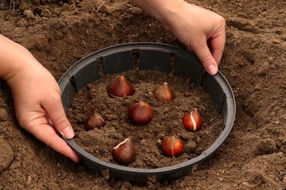 Bulbii se plantează la o adâncime de aproximativ 2,5–3 ori mai mare decât lungimea lor – în general între 8 și 15 cm. Cu cât bulbul este mai mare, cu atât trebuie plantat mai adânc. Pot fi plantați direct în sol sau în coșuri speciale pentru plantarea bulbilor (vezi imaginea), care îi protejează de rozătoare. Solul trebuie afânat în profunzime, până la 20–30 cm. Bulbii de primăvară preferă să fie plantați în grupuri, dar fiecare are nevoie de propriul spațiu pentru a se dezvolta – în cazul lalelelor, acesta trebuie să fie de cel puțin 10 cm. În consecință, distanța dintre bulbii individuali trebuie să fie de 10–20 cm.